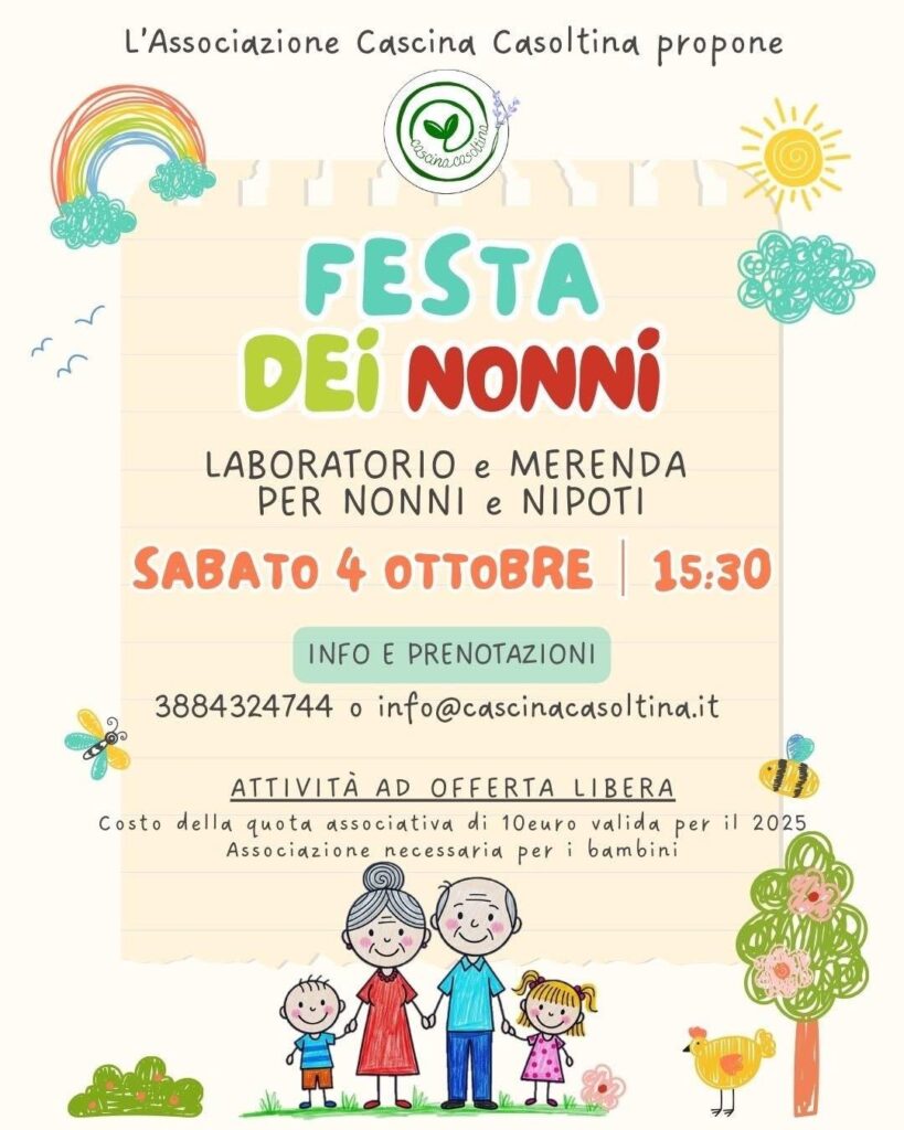 Festa dei Nonnidi Cascina Casoltinaon Pubblicato il 01/10/202501/10/2025 Laboratorio e Merenda per Nonni e Nipoti! Sabato 4 ottobre ore 15:30 presso Cascina Casoltina, Mulazzano (LO) Vuoi chiederci qualsiasi cosa? CONTATTACI