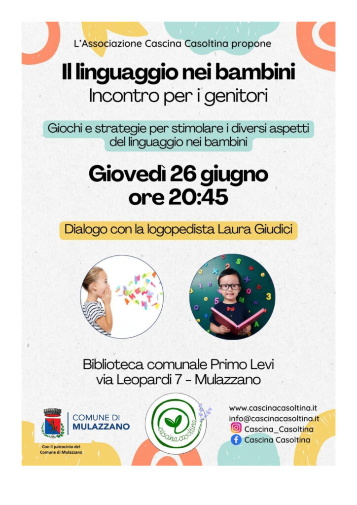 Il linguaggio nei bambini: Incontro per i genitoridi Cascina Casoltinaon Pubblicato il 20/06/202520/06/2025 Vieni a trovarci e parla con la logopedista Laura Giudici! Biblioteca comunale Primo LeviVia Leopardi 7, Mulazzano Vuoi chiederci qualsiasi cosa? CONTATTACI